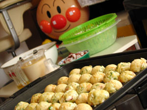 ぴろおパパがせっせとたこ焼きを焼いてくれます。ん・・・?視線を感じると思ったらアンパンマンが遠くから見つめていました。