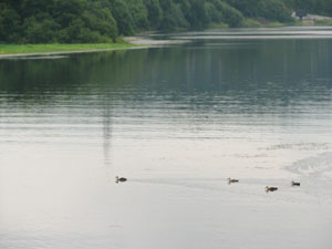 鏡のように静かな水面を、水鳥たちがスーイスイと。