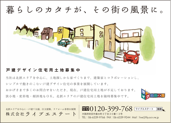 北摂エリアを中心に戸建デザイン住宅の事業を展開している会社、ライブエステートさんの土地募集広告のイラストを描きました。