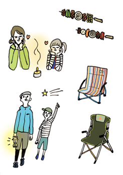 アウトドアブランドLOGOSのカタログ『はじめてのBBQ & CAMPカタログ』のイラストを描きました。