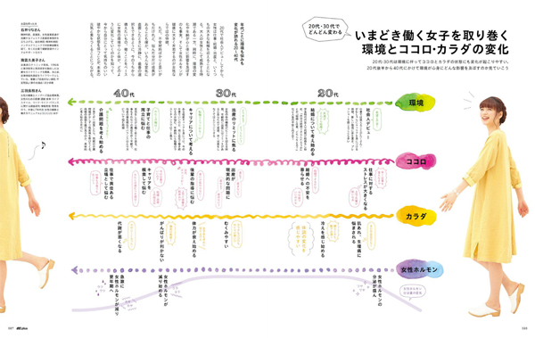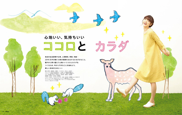 「心地いい、気持ちいい ココロとカラダ」特集の扉イラストをはじめ、枠線や模様、人物など20点ほど描きました。